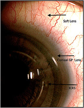 Piggyback Systems Many patients report corneal sensitivity over the segment after ICRS implantation. When fitting a corneal GP lens, a soft lens with a low power can be fitted underneath it to increase patient comfort. Additionally, the soft lens can aid in preventing mechanical irritation over the implanted ICRS. To minimize corneal hypoxia, fit a soft lens with a high Dk (Nosè et al, 1993; Louie et al, 2014; Smith and Carrell, 2008). Figure 7 illustrates a piggyback system over ICRSs in the left eye.