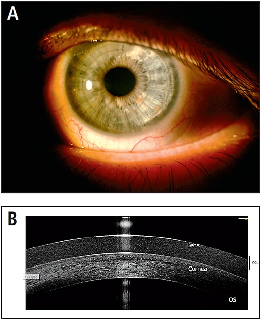 Figures 4 and 5 show a patient who has post-LASIK ectasia and who underwent CXL in both eyes and ICRS implantation in the left eye. The patient is wearing a standard soft toric design in the right eye (Figure 4A) and a soft lens for irregular corneas in the left eye (Figure 5A). An optical coherence tomography (OCT) cross-section of each lens is shown for the right (Figure 4B) and left (Figure 5B) eyes; notice the thickness difference between the two designs.