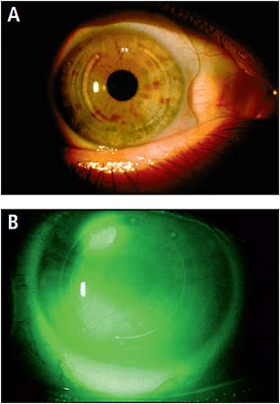 Scleral lenses are available in both regular and reverse geometry designs. Figure 9 shows two patients who were successfully fitted with scleral lenses after ICRS implantation. The first patient had keratoconus and a pinguecula in the right eye, and so the periphery of the lens was notched (Figure 9A). The second patient developed dry eyes and ectasia after LASIK, and a scleral lens was used to rehabilitate his vision and treat the dry eye symptoms in his left eye (Figure 9B).