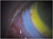 Figure 2. An example of non-uniform scleral lens edge blanching, typically at 3 o’clock and 9 o’clock. This patient would benefit from a toric haptic system.