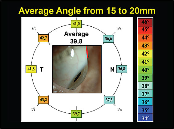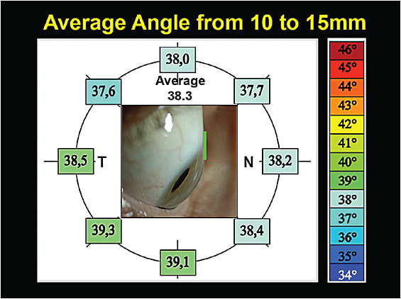 The Pacific Scleral Lens Study measured 96 eyes and 1,536 scleral angles to assess anatomical shapes of normal and keratoconic eyes (Kojima et al, 2013). A chord length was set to 15.0mm and also to 20.0mm (Figure 3). At the 15.0mm chord, the variability among the scleral angles measured in eight different quadrants ranged from 37.6º to 39.3º (Figure 4). At the 20mm chord, the variability increased, ranging from 36.6º to 43.2º (Figure 5). This indicates that the further away from the limbus, the greater the variability in scleral shape. What this means is that the need for toric peripheral curves with scleral lenses will increase as the lens diameter increases.