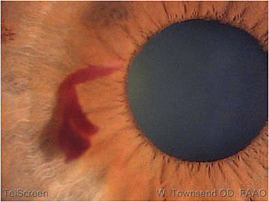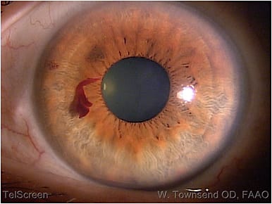This image shows a 64-year-old Caucasian female who presented with recent onset blurring in her left eye; she also noted a “red spot” on the iris at the same time (Figure 1). Visual acuity was 20/20 in both eyes. She denied any recent or prior trauma to either eye. She did report some “heavy lifting” in the past two days. Her only habitual medication was one 80mg aspirin every day, which had been prescribed by her primary care physician for its anti-clotting properties. Her blood pressure was 116/68, and her applanation intraocular pressure (IOP) was 11 mmHg in both eyes.