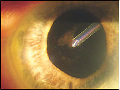 This photo shows the left eye of a 79-year-old patient who has iridocorneal endothelial syndrome (ICE). She presented with corneal edema, dense endothelial pigmentation, broad areas of inferior peripheral anterior synechiae (PAS), and anterior chamber tube shunt. Her uncorrected visual acuity was OS 20/250, pinhole 20/150. Intraocular pressure (IOP) measured 11mmHg. She was taking Pred Forte (Allergan) 1% q.d. and ketorolac q.d., both OS.