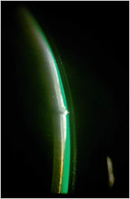 Another test of aqueous tear production is the fluorescein clearance test. This test may be more accurate; however, it is rarely performed in clinical practice. The fluorescein clearance test measures the clearance of 5mL of 2% sodium fluorescein that has been instilled into the eye. Then, after 15 minutes, the color of the lateral tear meniscus is evaluated using fluorophotometry and is matched to a scale. Dry eye causes delayed clearance of fluorescein. The rate of clearance relates to tear production. A value of three is the threshold between normal patients and symptomatic patients.
