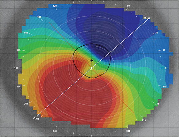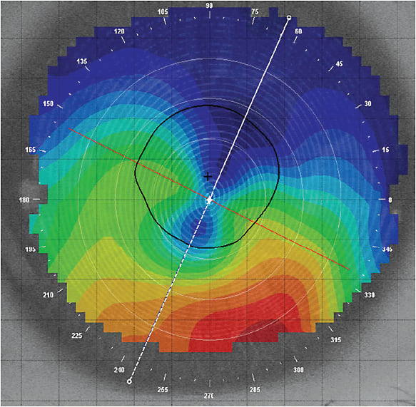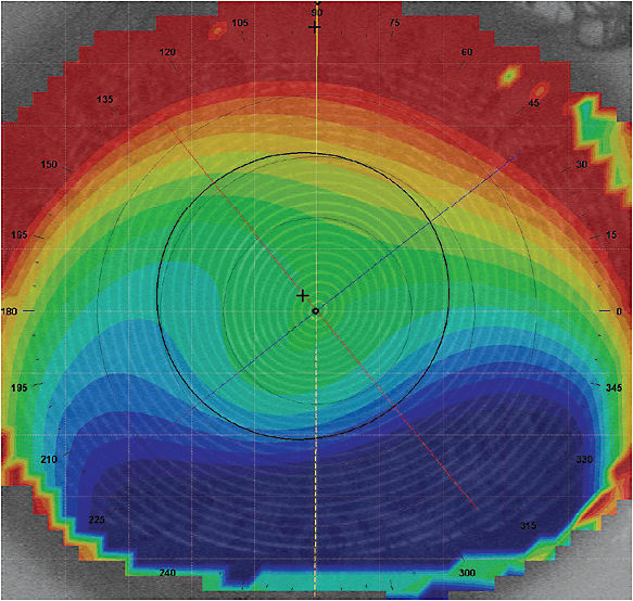 As an example, from the axial power topography map in Figure 5, we initially expected that a large corneal GP would be able to adequately fit this keratoconic cornea. After several frustrating attempts to eliminate bubbles under the lens, we finally selected a scleral lens and fit the patient successfully. A later analysis of the elevation map of this cornea (Figure 6) revealed a height difference of 423 microns, which indicated that utilizing a corneal lens would be problematic. Knowing the height differential information reported by Caroline and André could have prevented aggravation for both patient and practitioner.