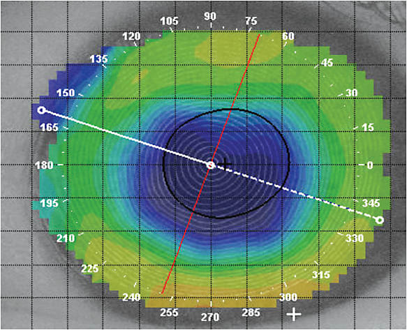 It would be helpful if there was a way to know when to select a corneal GP versus a scleral lens to save chair time, but how do you know when the corneal irregularity is too severe for a corneal GP lens? Caroline and André (2015) have suggested that a change in elevation greater than 350 microns (using the topographical elevation map) between the steepest and flattest portion of the cornea along the meridian of greatest elevation difference would be too pronounced to be fit successfully with a corneal GP.