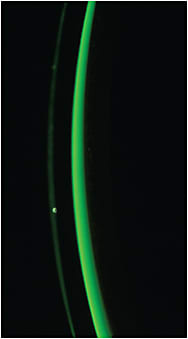 To make the tear lens more visible for evaluation, instill a drop of sodium fluorescein in the nonpreserved saline that fills the bowl of the scleral lens. Following fluorescein instillation, vault is best evaluated using an optic section with white light (Figure 11); it is more difficult to evaluate with cobalt blue light. Adequate corneal clearance is demonstrated by an even pattern of fluorescein with no areas of bearing in primary position with a wide beam (van der Worp, 2015; DeNaeyer et al, 2013).