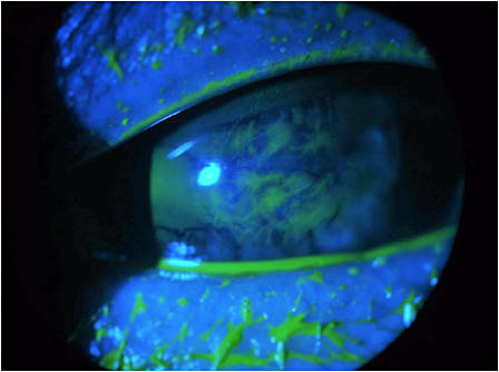 The pictured corneal abrasions with fluorescein staining were caused by his last contact lens in his left eye, which had the following parameters: base curve (BC) 74mm x 48mm, overall diameter (OAD) 9.8mm, and optical zone diameter (OZD) 6.0mm. His visual acuity with this contact lens 20/40.