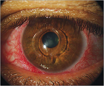 This image shows a case of conjunctival hyperemia due to use of a scleral lens.