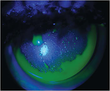 We could not imagine that the patient, as a long-term GP lens wearer, was not complying with proper care, cleaning, and maintenance of her new lenses.1 But, we asked her whether she had changed the multipurpose solution and whether she was cleaning the lenses after removal. It was a surprise to learn that, for some unknown reason, she was not cleaning her lenses after removal. She wears her lenses for 15 to 16 hours a day and reported that she was only cleaning them in the morning prior to application.