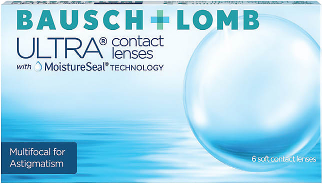 Bausch + Lomb Ultra Multifocal for Astigmatism lenses are manufactured in samfilcon A (46% water) with MoistureSeal Technology. Parameters include 8.6mm base curve, 14.5mm diameter, spherical powers from +4.00D to –6.00D in 0.25D steps, cylinders of –0.75D, –1.25D, –1.75D, –2.25D, and –2.75D in axes of 10° to 180° in 10° steps, and add powers of +0.75D to +1.50D (Low) and +1.75D to +2.50D (High). The center thickness is 0.10mm for a –3.00D lens. Call (800) 828-9030 or visit www.bausch.com . ■