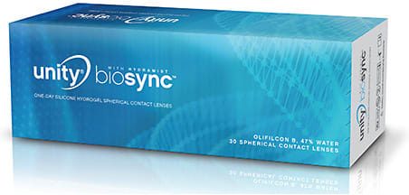 Unity BioSync is manufactured in olifilcon B, which has a water content of 47% and a reported Dk/t of 150. Parameters include a base curve of 8.8mm, a diameter of 14.1mm, and sphere powers of +8.00D to –10.00D (0.50D steps above ±6.00D).