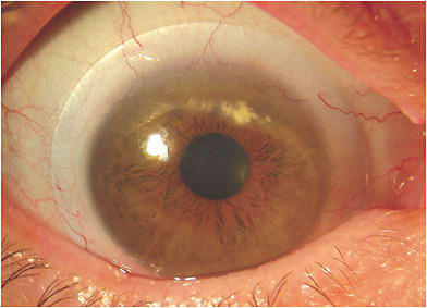 This photo shows corneal lipid deposition in the right eye of a 57-year-old keratoconus patient. He was originally referred for keratitis secondary to chronic inflammation that resulted from an ill-fitting hybrid contact lens. Superior residual lipid deposition and corneal scarring have remained despite resolution of the inflammation.