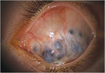 Fetal alcohol syndrome can cause several teratogens such as learning disabilities, dysmorphisms, growth retardation, and central nervous system deficiencies.1 Ocular findings may include one or more of the following: strabismus, coloboma, microphthalmia, blepharoptosis, hypertelorism, epicanthus, and shortened palpebral fissures.1 Treatment for corneal staphyloma is usually geared toward evisceration or enucleation.2 Penetrating corneal transplants may be successful in mild forms, but graft failure is high in more advanced cases.2 It is uncertain whether the corneal staphyloma occurred from surgical complications or congenital glaucoma in this patient. For patients who defer enucleation, an ocular prosthetic (scleral shell) may improve cosmesis. Soft ocular prosthetics may not fit appropriately due to the irregular curvature of the anterior segment.
