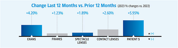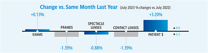 Here, we share July 2023 practice data reported by GPN on Aug. 7. Compared to June 2023, July saw decreases in all categories. However, July of this year compared to July 2022 saw slight decreases in frames, spectacle lenses, and contact lenses; exams and patient payments were slightly up.