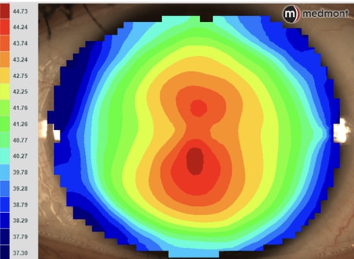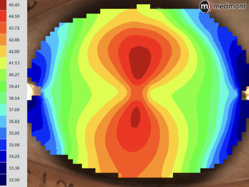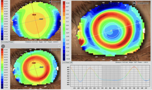 When analyzing the ocular shape, a spherical cornea is generally an ideal candidate. While astigmatic eyes are not contraindicated, treating certain types of astigmatism with ortho-k can be more straightforward, such as apical compared to limbus to limbus (Figures 2 and 3).