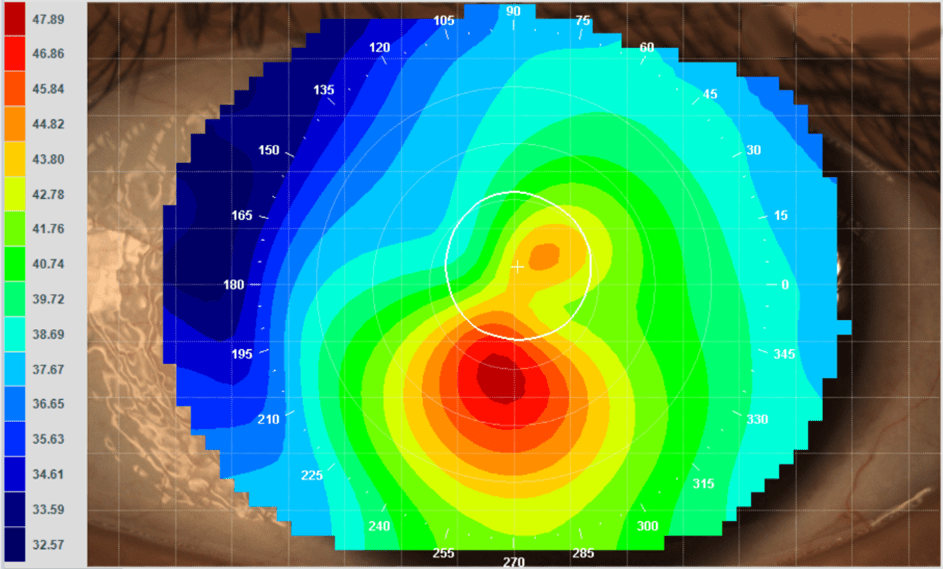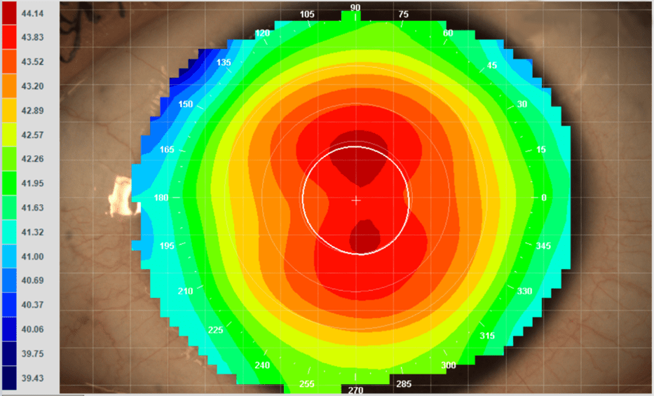 Another unique analysis display option on corneal topography is the “axial” interpretation, which aids the clinician in understanding whether the patient has regular or irregular astigmatism (Figures 2 and 3). In aiding in the assessment of early signs of keratoconus, the instrument can be critical to diagnosing the condition and ensuring the patient is referred for corneal cross-linking, where appropriate, to protect corneal health and visual function.