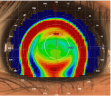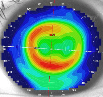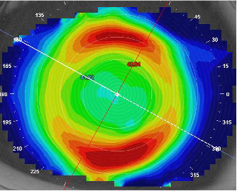 Incomplete reverse curve rings form when a lens fails to align to the peripheral cornea in one meridian. This results in an uneven ring of mid-peripheral steepening, preventing the central fluid pressure from achieving the desired corneal compression. On topography, incomplete reverse curve rings will present as an uneven “bull’s-eye” ring. The reverse curve may be incomplete in only one quadrant (Figure 2) or across an entire meridian (Figure 3).