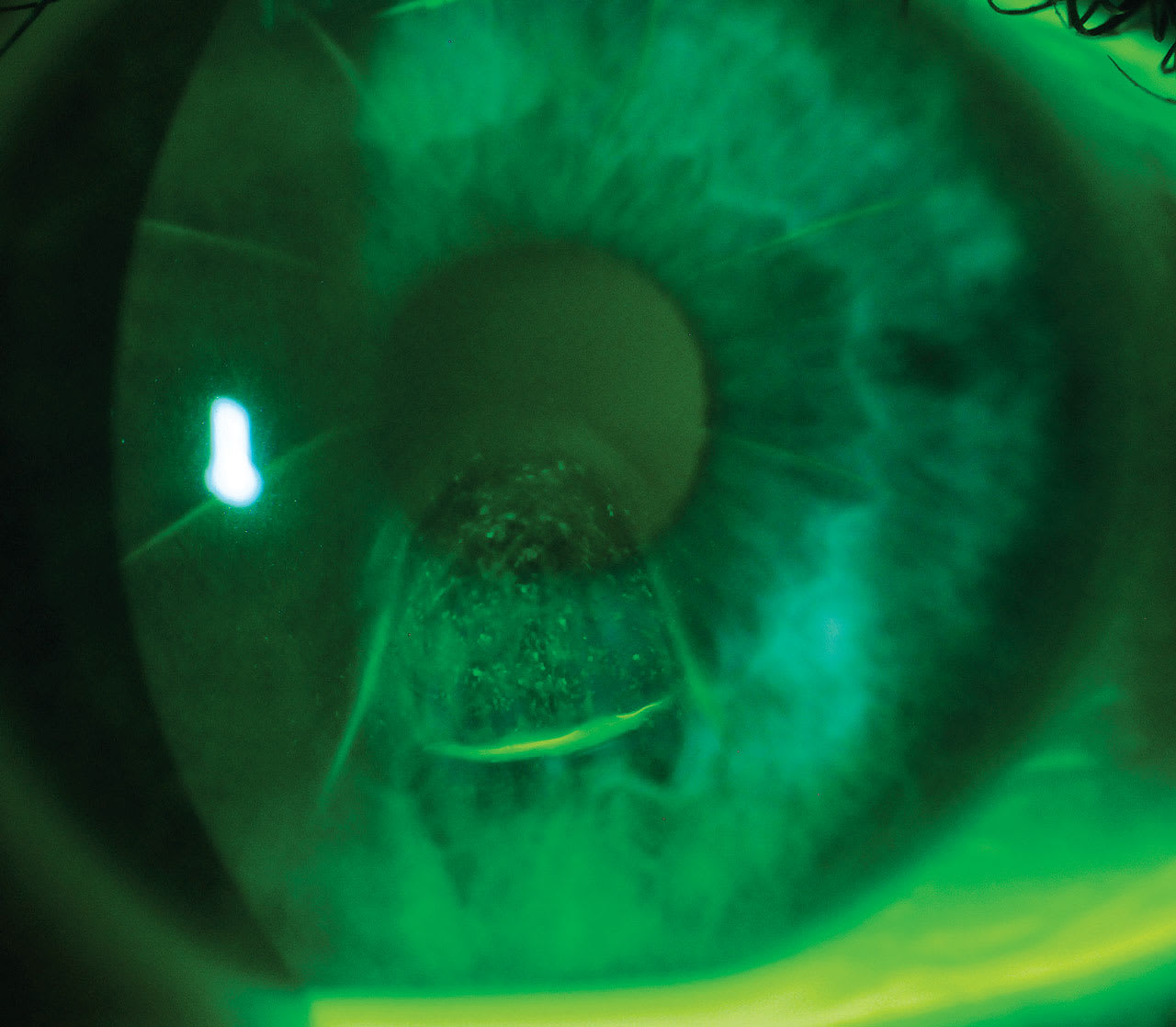 A 50-year-old female presented for a consultation for possible contact lens fitting. She had a history of radial keratotomy (RK) 20 years prior and had 15 years of good vision. Over the last five years, she reported decreasing vision. And over the last 12 months, she reported feeling unsafe driving and had taken a leave from her job as a nurse until she could improve her vision and become functional again. Best-spectacle-corrected vision was 20/60 in each eye. The slit lamp examination in the left eye looked similar to the right eye, pictured above.