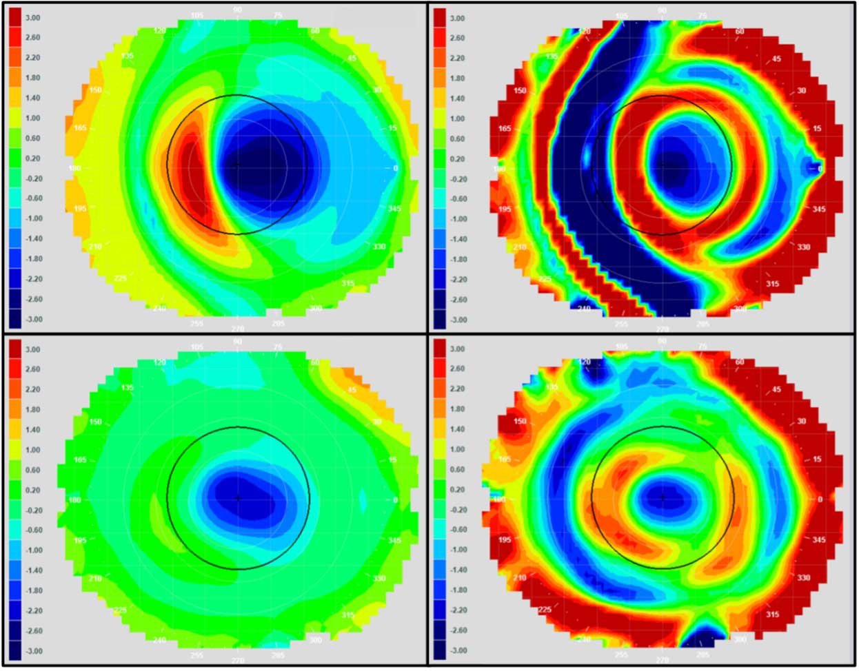 Topography is a useful tool for analyzing the lens centration and performance in a closed-eye environment. Topography allows practitioners to view lens centration and treatment that occurs while the patient is sleeping. Ideally, the topography reveals a “red ring” centered around the pupil indicating midperipheral steepening in the reverse curve area and flattening in the central treatment zone; however, this is not always the case, and fit changes may be indicated to improve centration.