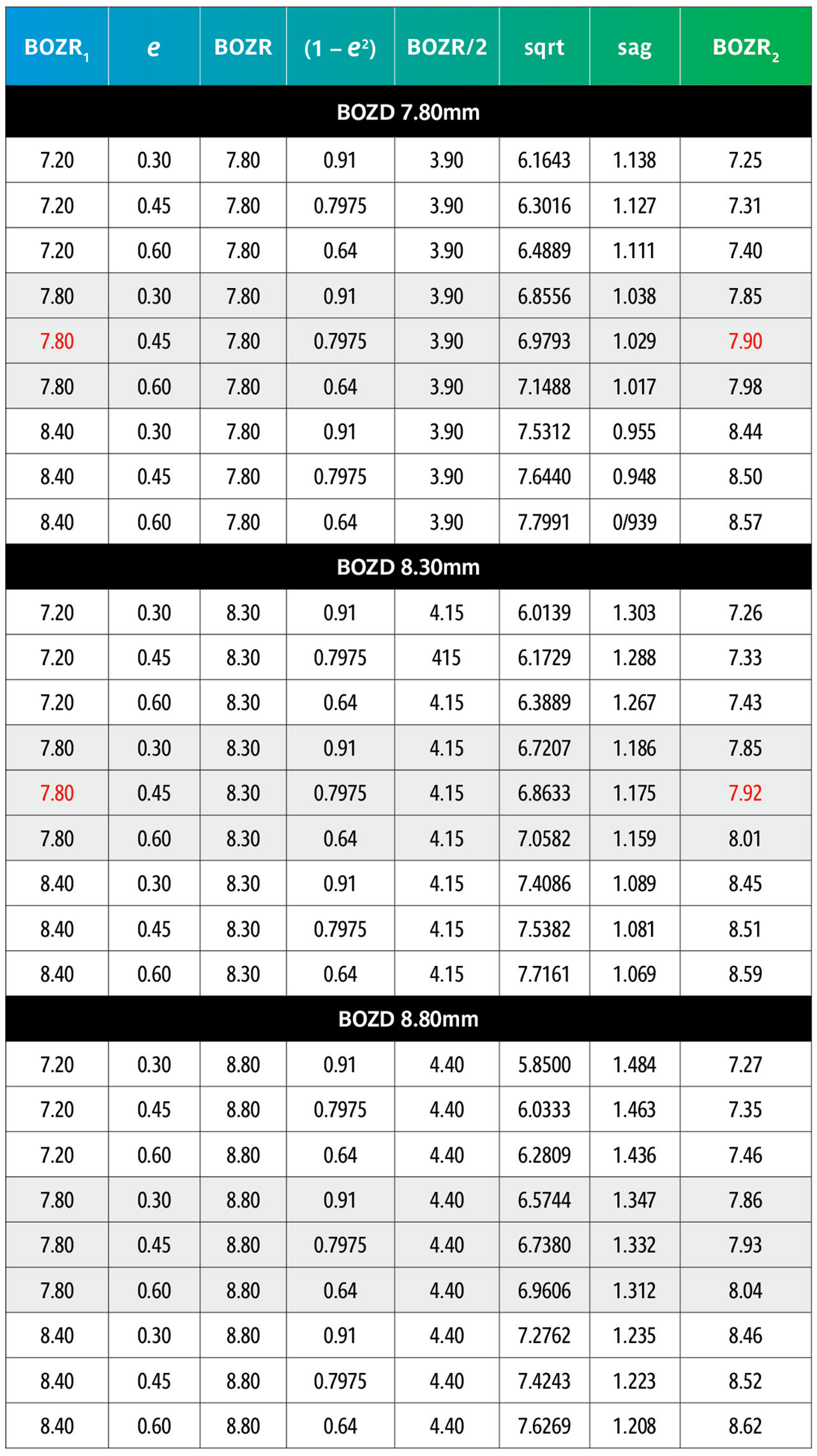 • Increasing the BOZD will require a flatter fit and vice versa. For an average e value, a compensatory change of 0.10mm to 0.15mm in BOZR is required (range 0.05mm to 0.25mm, depending on the e value) for every 0.50mm change in BOZD.