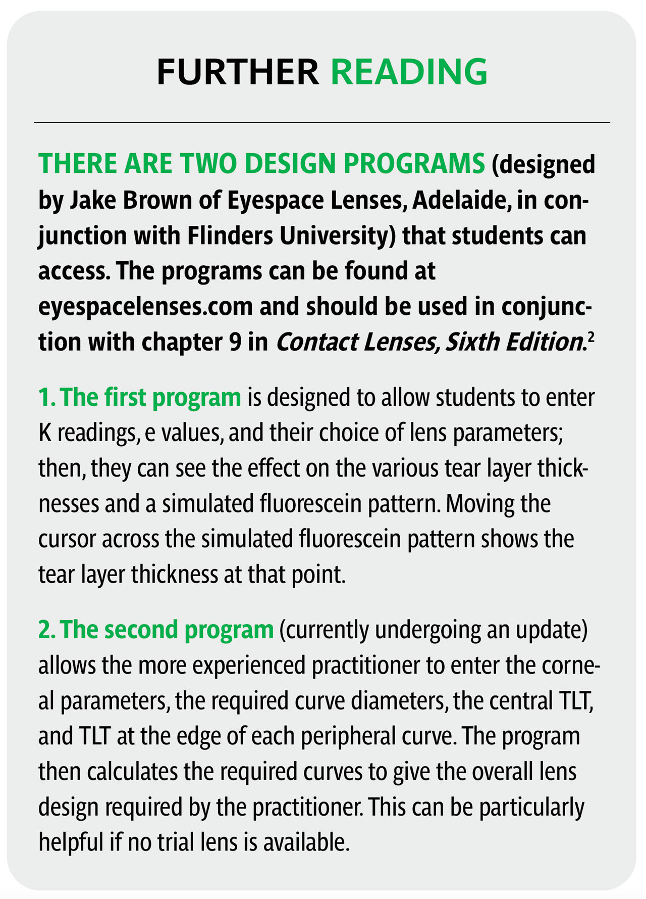 Thus, increasing or decreasing the BOZD by 0.50mm requires a change in BOZR of approximately 0.05mm for low corneal eccentricity values, 0.10mm to 0.15mm for midrange e values, and 0.20mm to 0.25mm for steep corneal eccentricities. This then provides a guide when selecting a new trial lens with a different BOZD (and logically an equally larger or smaller TD trial lens).