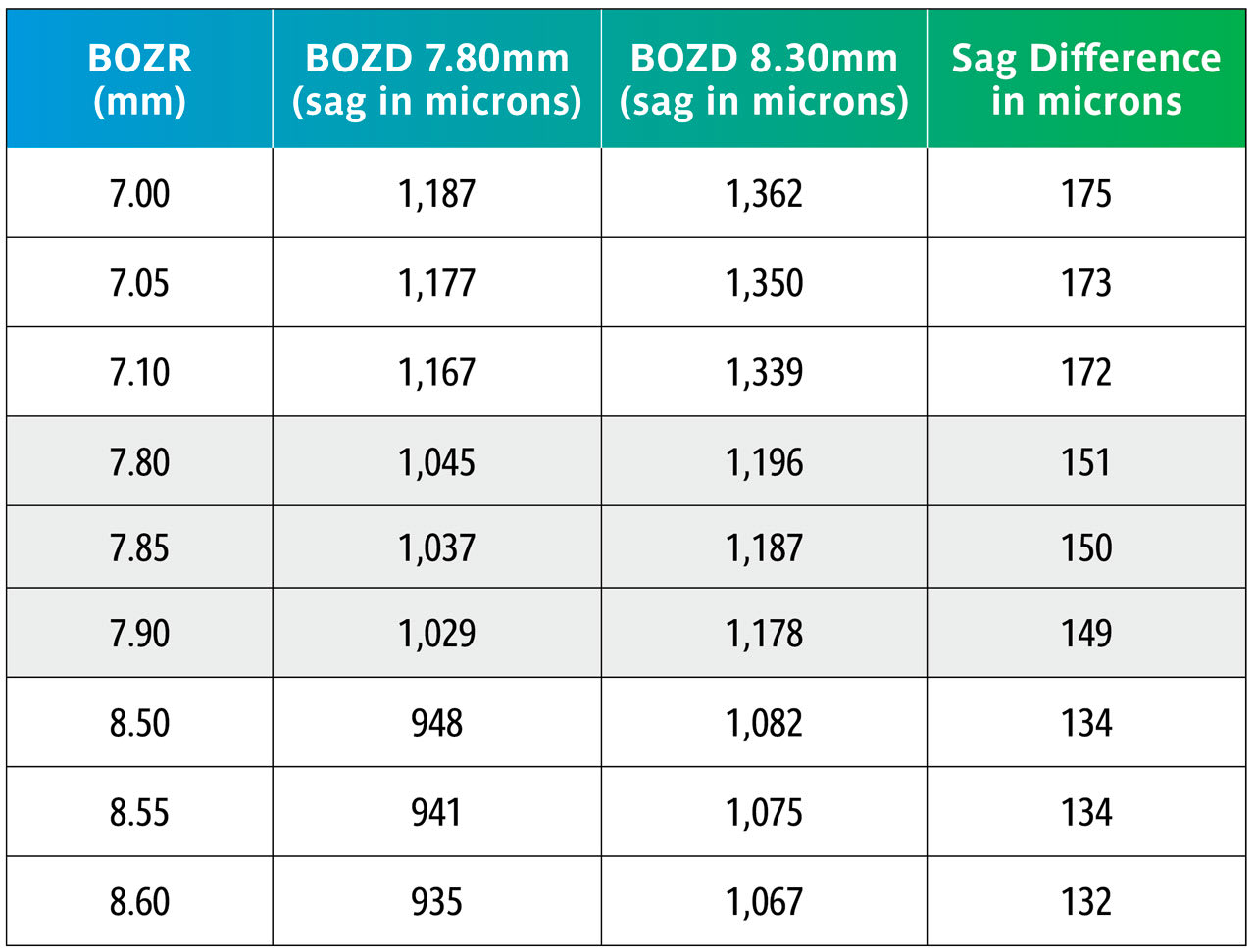Normal Corneal Curvatures Table 1 shows the change in sagittal (sag) heights across the normal range of corneal curvature when the BOZD is changed by 0.50mm using typical values of 7.80mm to 8.30mm and using three radii for each level.