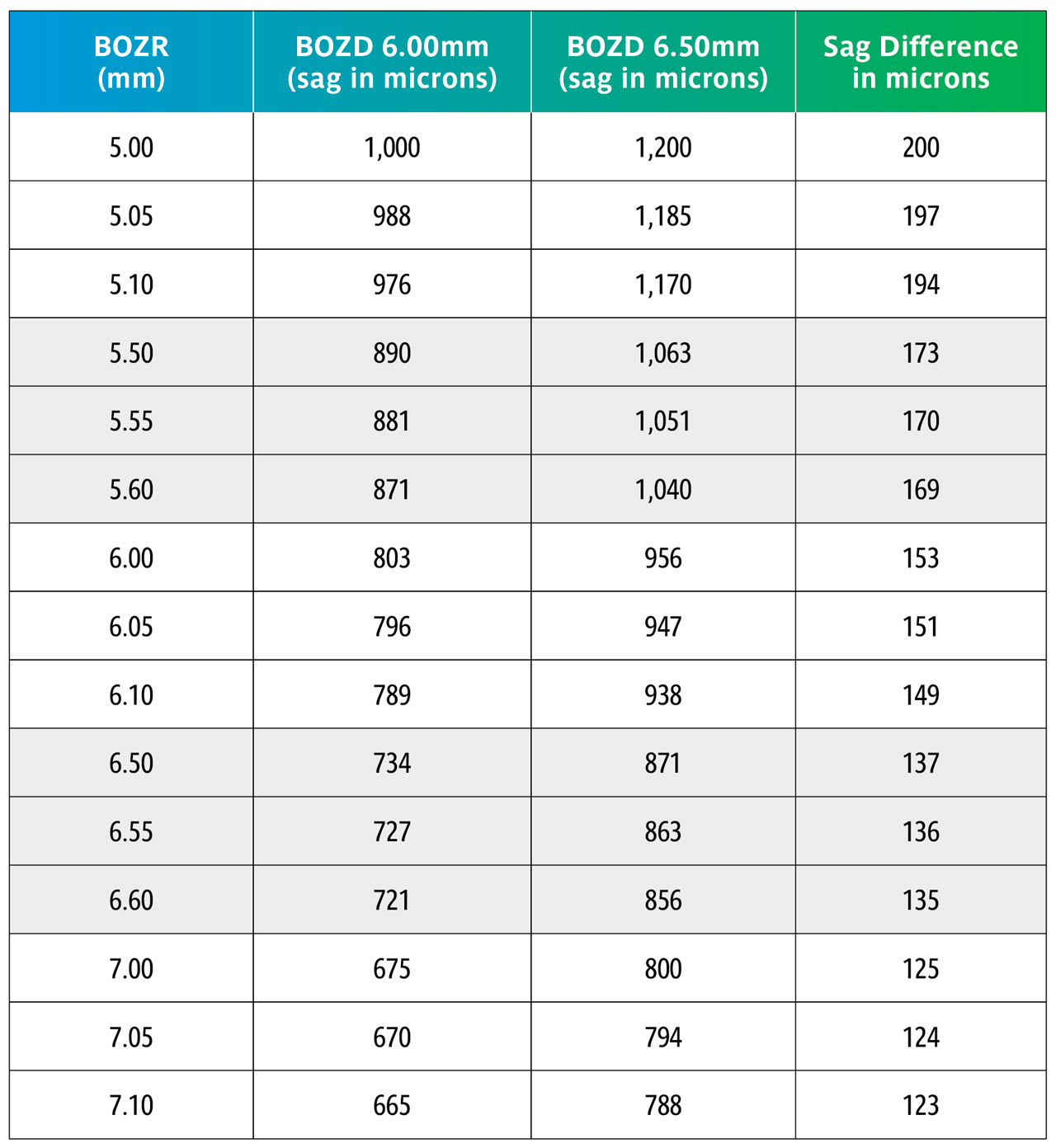 • A typical clinical change of 0.50mm in BOZD produces a very significant change in lens sag requiring a compensatory change in BOZR. It should be noted that this applies over all radii including keratoconus designs.