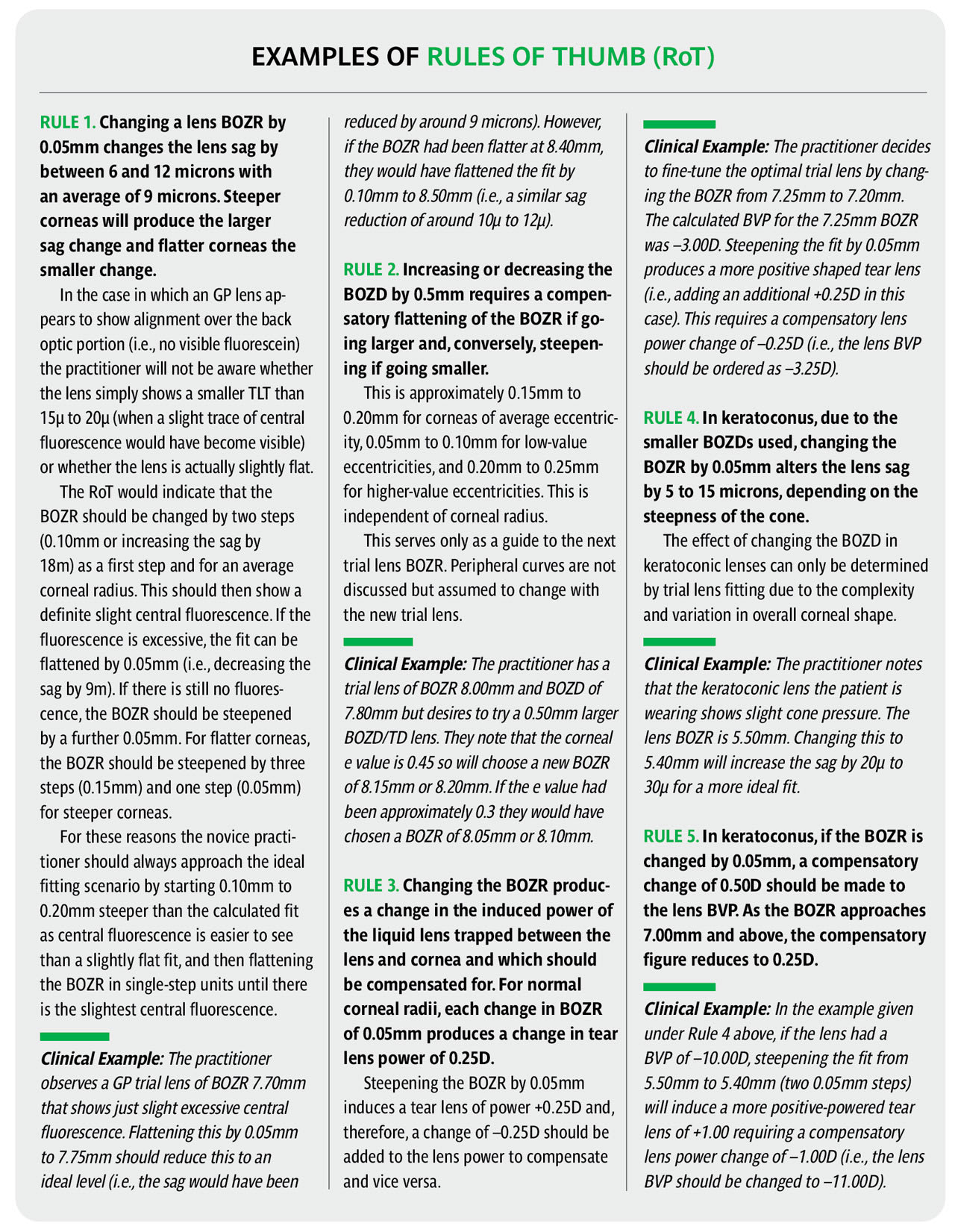 With such small micron level thicknesses involved, the practitioner needs to be cognizant of how to change the BOZ parameters to achieve an optimal GP lens fit. For the novice practitioner and student, knowing how to manipulate the lens parameters to achieve an “ideal” fit cannot only be difficult, but often confusing. The experienced practitioner will look at a fit and say “I need to steepen (or flatten) the BOZR by 0.20mm”—but this may take many years of practice!