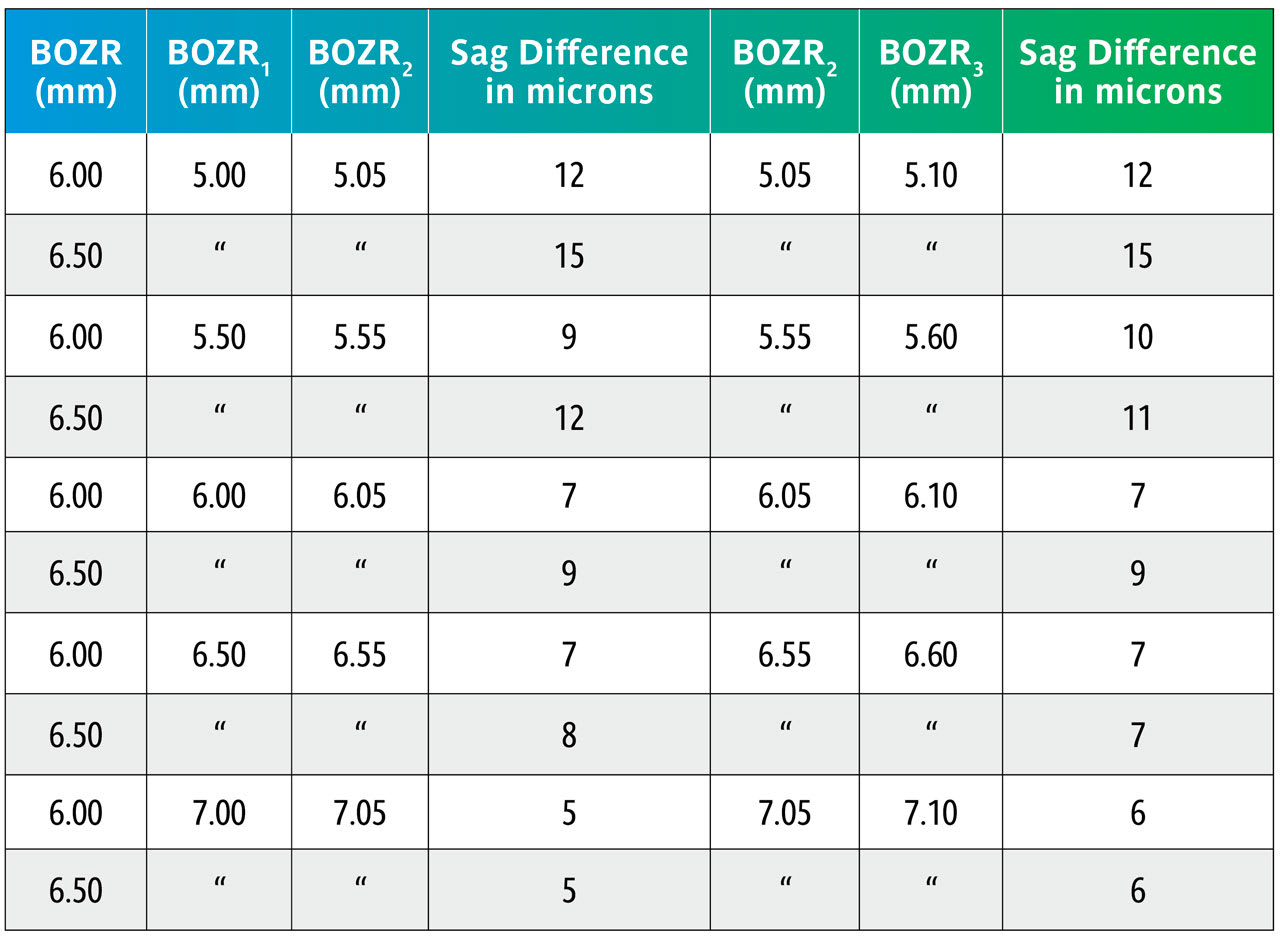 The data in Table 2 shows that varying the BOZR by 0.05mm steps changes the central lens sag by 6µ to 12µ with an average of 9µ.