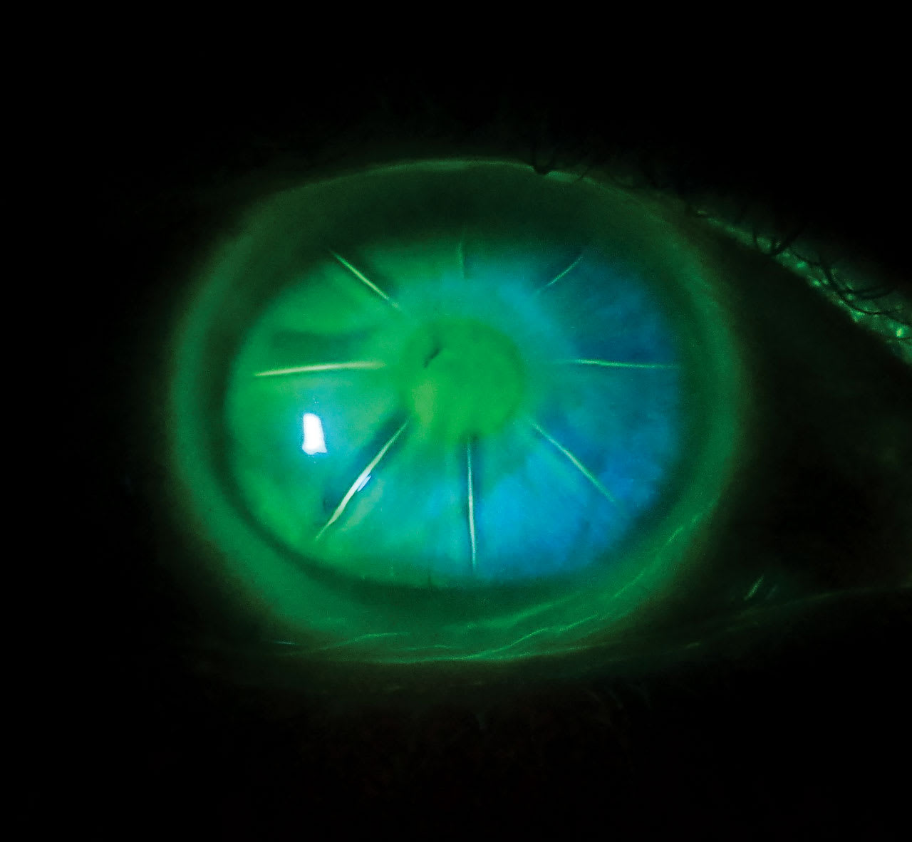 ALTHOUGH RADIAL keratotomy (RK) was eventually eclipsed by laser vision correction, 250,000 RK procedures were performed annually at the peak of its popularity in the early 1990s for the correction of myopia (National Eye Institute, 1994). The surgery involved making 4 to 32 (sometimes more!) deep radial corneal incision (Figures 1 and 2) that resulted in corneal flattening. Three-year results of the Prospective Evaluation of Radial Keratotomy (PERK) study showed that 58% of eyes had refractive error within 1.00 D of emmetropia, 26% were undercorrected, and 16% were overcorrected by more than 1.00 D (Waring et al, 1987).