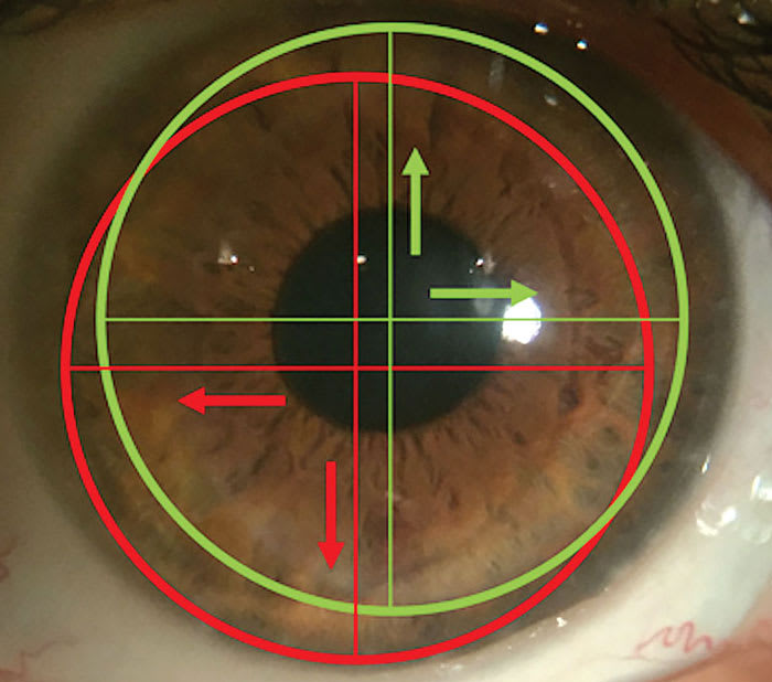 The optical performance of SLs must take into consideration pupil size and location, lens decentration, and corneal abnormalities. Therefore, front optic zone customizations should be aligned with the patient’s visual axis rather than the geometric center of the SL (Figure 2). Misalignment can cause residual aberrations, fluctuating vision, decreased contrast sensitivity, and non-optimal vision quality.