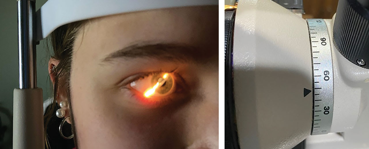 It is critical to complete 2 things before introducing astigmatism correction into a scleral lens. First, make sure that you finalize all fitting characteristics such that fit is optimized and the lens is rotationally stable. Second, measure the position/rotation of the lens by assessing the markings on either the steep or the flat meridian of the lens as precisely as possible. Rotating the slit lamp beam so that it aligns with the markings on the lens can be useful for documenting this position (Figure 1).