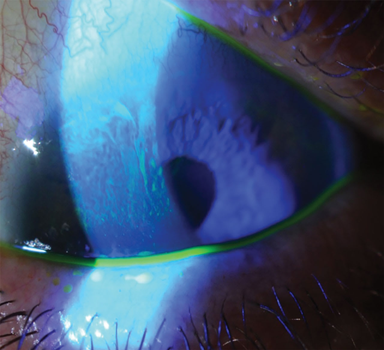 If this process is disrupted and eventually becomes nonfunctional, limbal stem cell deficiency (LSCD) results (Rossen et al, 2016). LSCD has multiple etiologies, and one study found that 16.8% of LSCD cases were secondary to contact lens wear (Cheung et al, 2021). LSCD can be identified clinically with varying presentations including corneal neovascularization, persistent epithelial defects, and several degrees of whorl or late fluorescein staining (Jeng et al, 2011; Cheung et al, 2021) (Figures 1 and 2). Limbal late or whorl staining is due to uptake of the conjunctival epithelium cells that have crossed over to the cornea and hold fluorescein dye longer than healthy corneal epithelial cells (Kim and Mian, 2017).