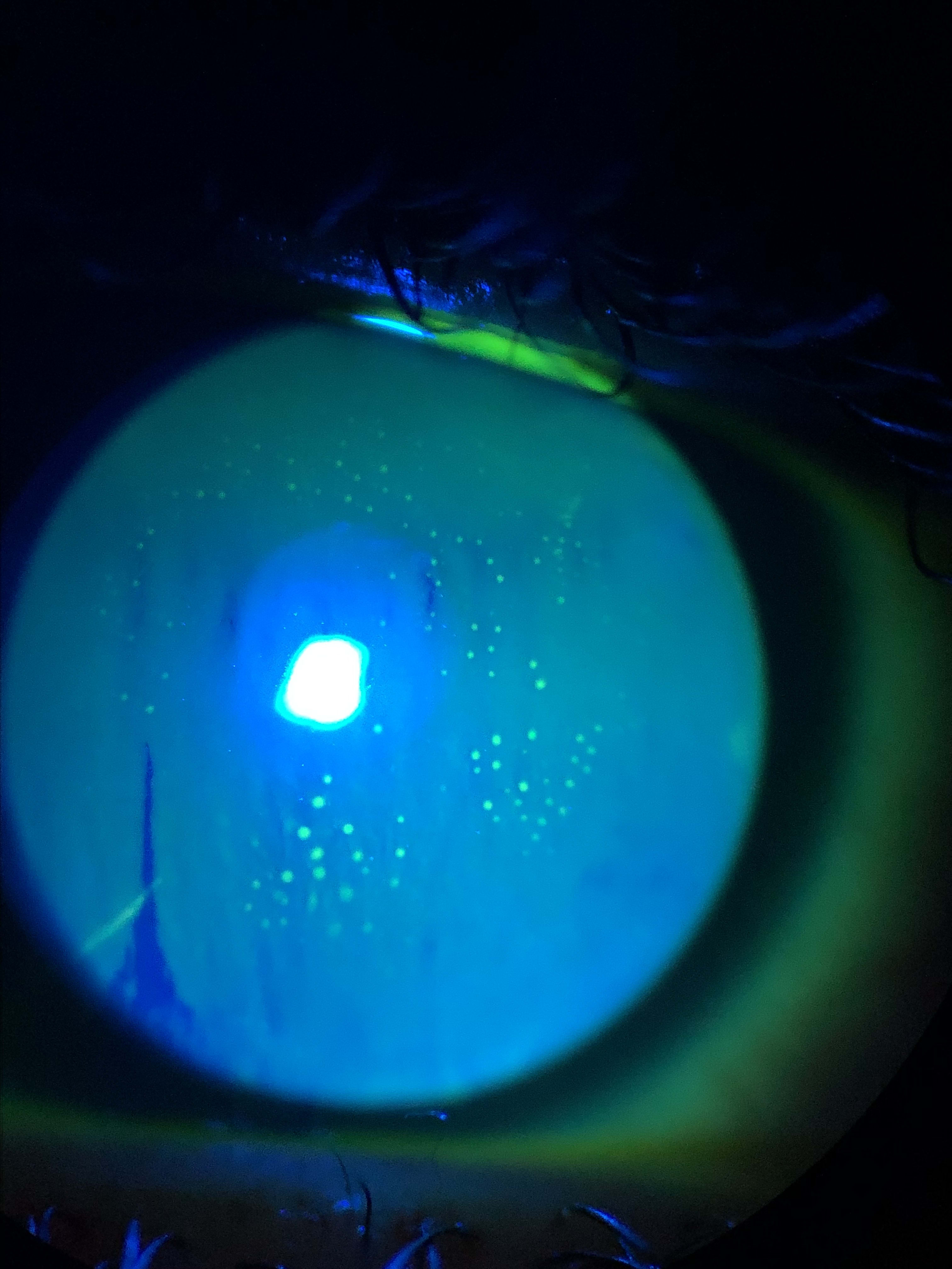 Dimple veiling can sometimes be confused with punctate epithelial erosion (PEE) staining (Figure 3). However, dimple veiling is much brighter and very circular in shape compared to PEE. It is caused by small air bubbles under a lens that indent the cornea, allowing NaFl to pool. This effect resolves after discontinuing lens wear for several minutes to hours.