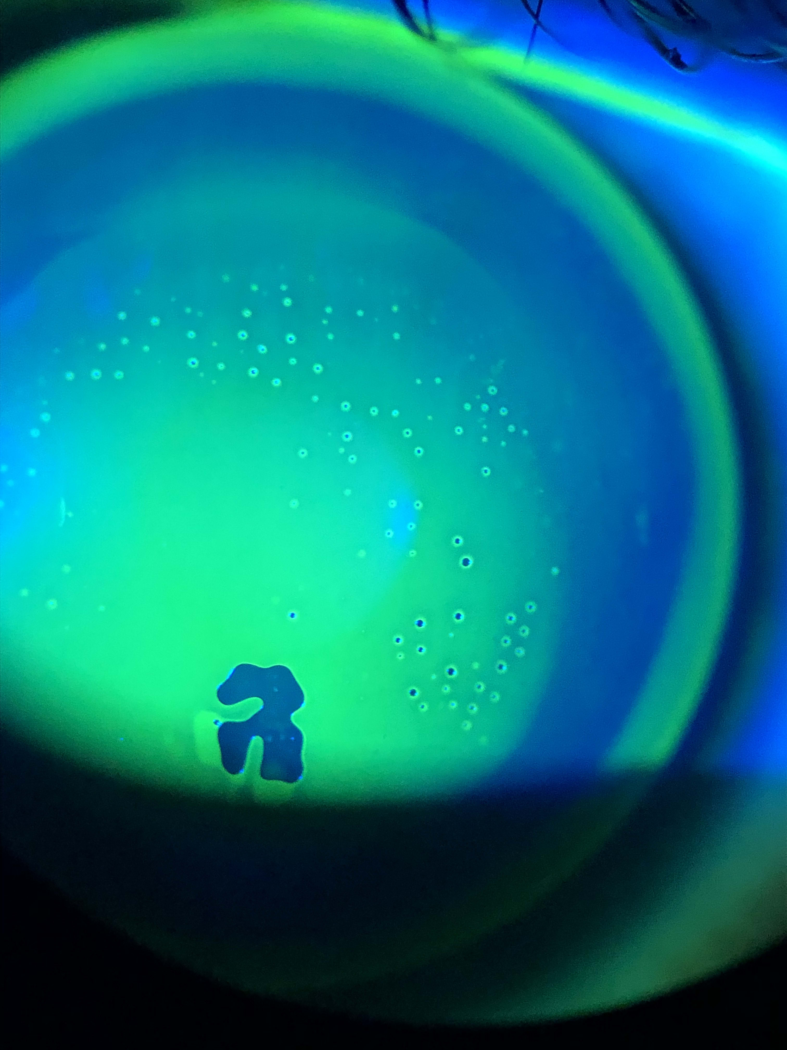 Evaluation of the corneas after lens removal revealed several discrete circular areas of hyperfluorescent sodium fluorescein (NaFl) (Figure 1). With the corneal GP lenses applied, small air bubbles were noted over the same areas of hyperfluorescent NaFl with an isolated larger bubble in the left lens (Figure 2). The small air bubbles were identified as dimple veiling; however, the larger air bubble signified a steep fitting relationship and new lenses were ordered to improve the fit.