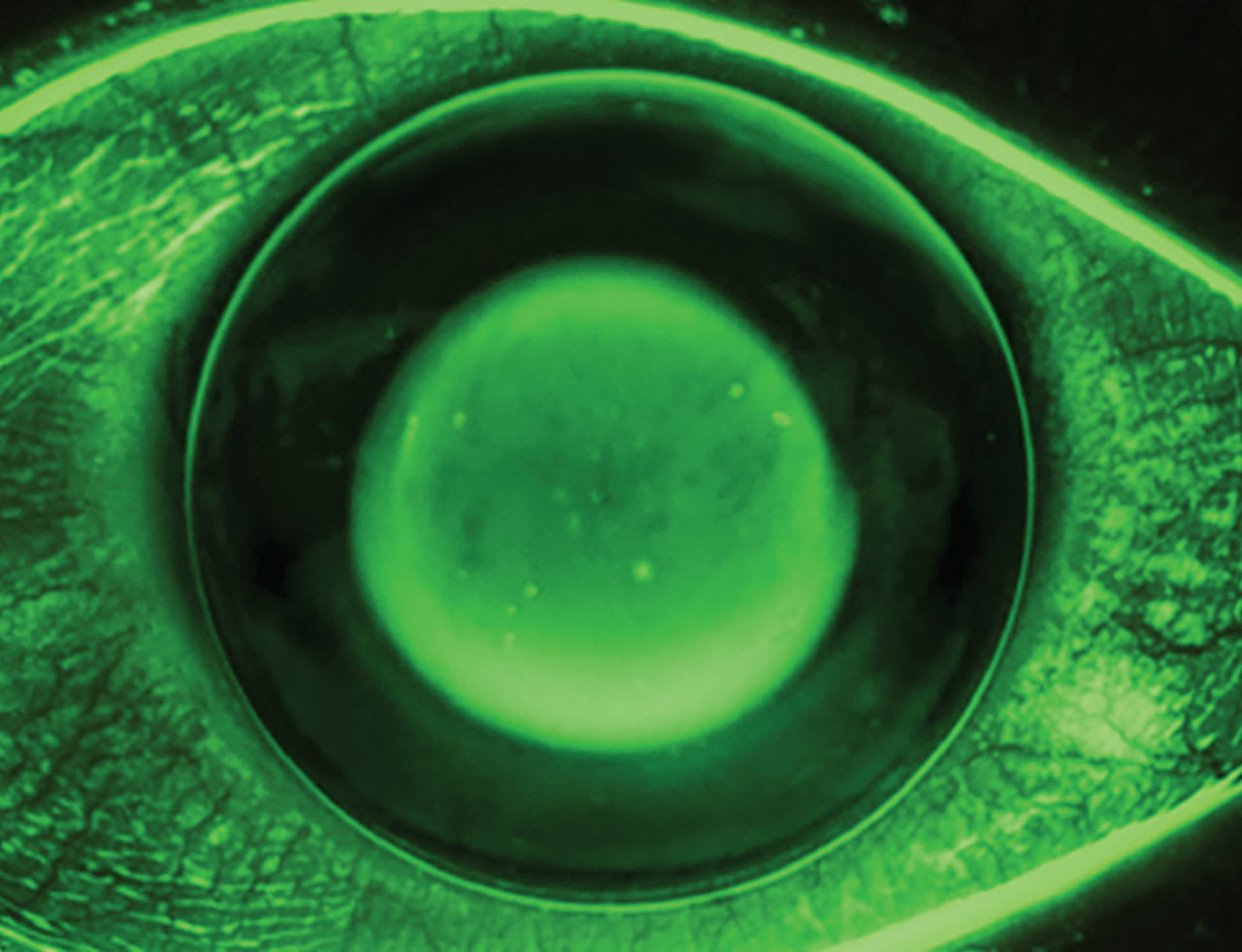 While scleral and ortho-k lenses with excessive edge lift can be problematic, so can those with tight-fitting relationships. Ortho-k lenses with alignment curves that are fit too steep to the peripheral cornea can create lens binding that leads to peripheral corneal staining and ocular discomfort. Understanding how the central lens–cornea relationship should look at dispense and follow-up visits can take some time to master. The dark central area of an ortho-k fit should appear defined, but the borders of the surrounding NaFl bull’s-eye will show some tear movement or exchange over the central cornea as the lens moves slightly on blink.