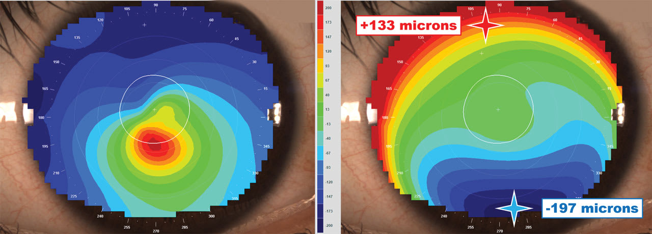 Determining whether a cornea has enough symmetry to support the fit of a corneal contact lens is very useful in clinical practice. If the cornea’s elevation differential is above 350 microns, the recommendation is to choose a scleral lens that will be supported on the relatively more symmetric sclera, vaulting the highly irregular cornea entirely.