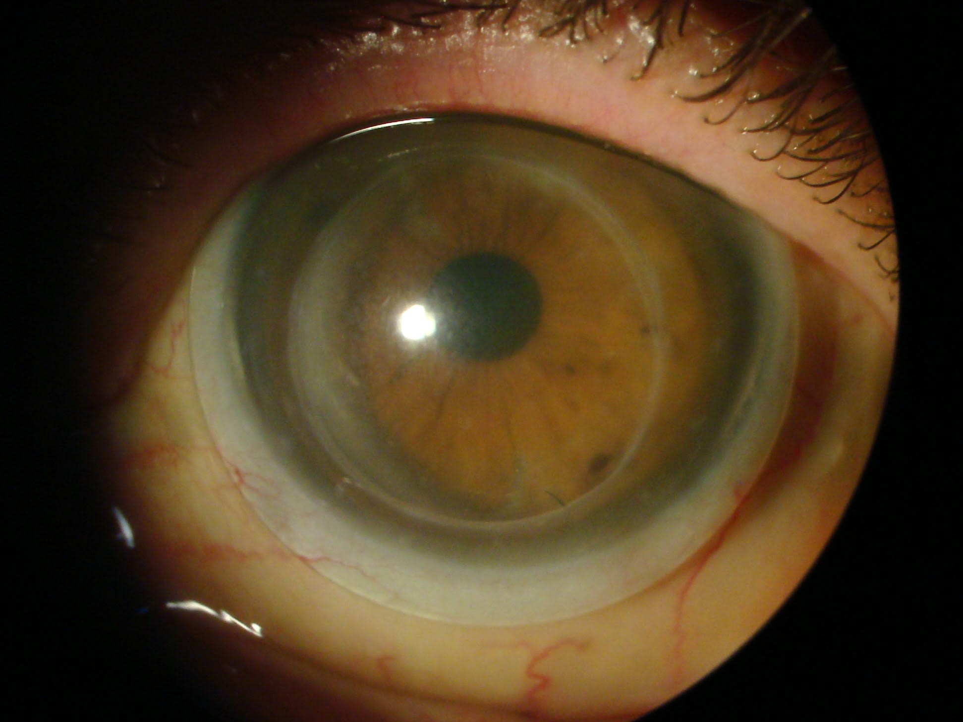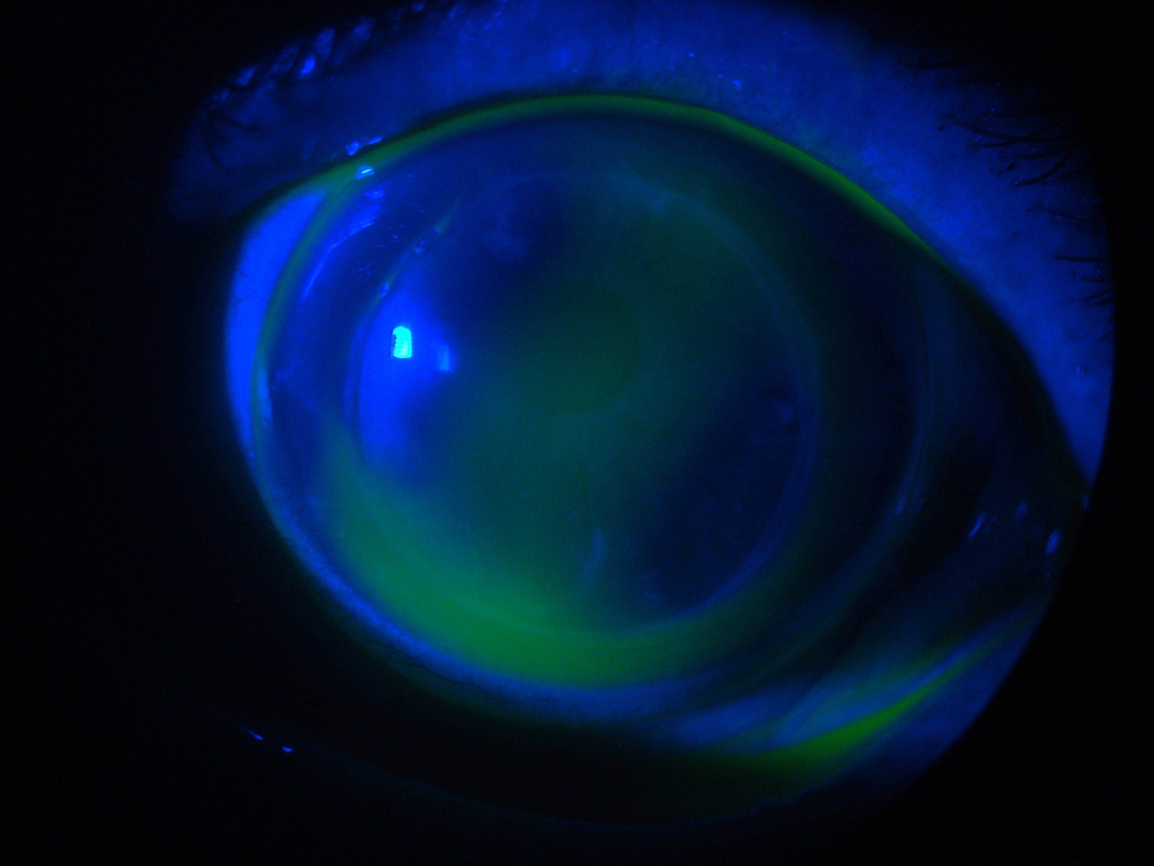 Standard corneal GP designs often fail to center due to high eccentricity, irregular elevation, and steep periphery. The image shows a fitting with paracentral touch at 4 o’clock. Figure 2 shows localized keratitis beneath the GP bearing zone.