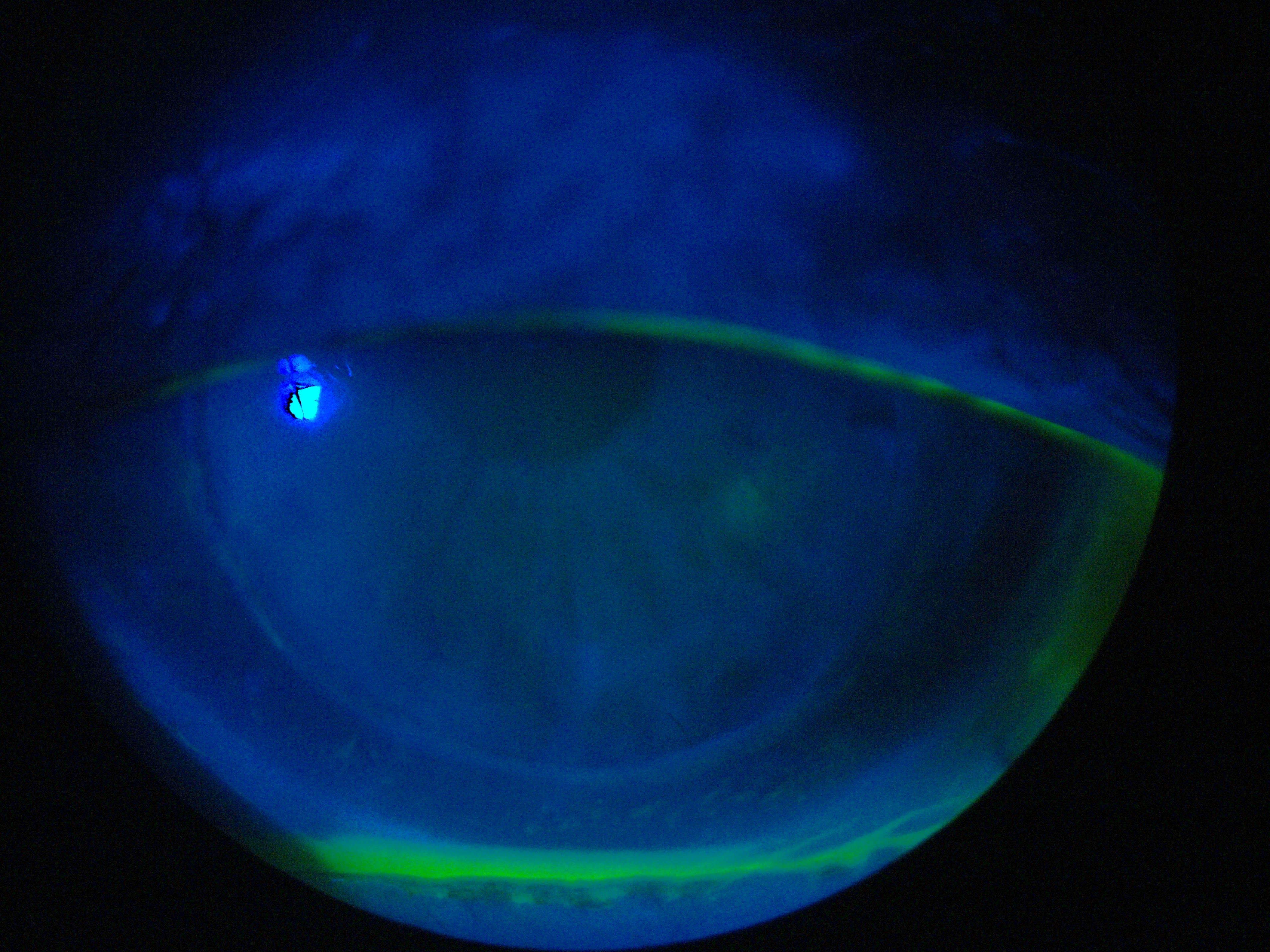 A second attempt used a 14.5 mm corneoscleral lens (Figure 4), which improved centration and alignment. Although clearance could still be optimized, the patient was instructed to use nonpreserved lubricating drops in the bowl to avoid air bubbles. Post-graft patients previously using GPs often apply larger lenses incorrectly, leading to bubbles. Patient education and application training are crucial (Figure 5).