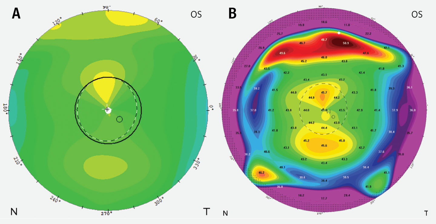 Elevation maps help identify the location of the corneal apex. When the apex is displaced inferiorly, the lens frequently decenters in the same direction. Even small amounts of decentration can result in ghosting or flare, particularly under mesopic conditions.