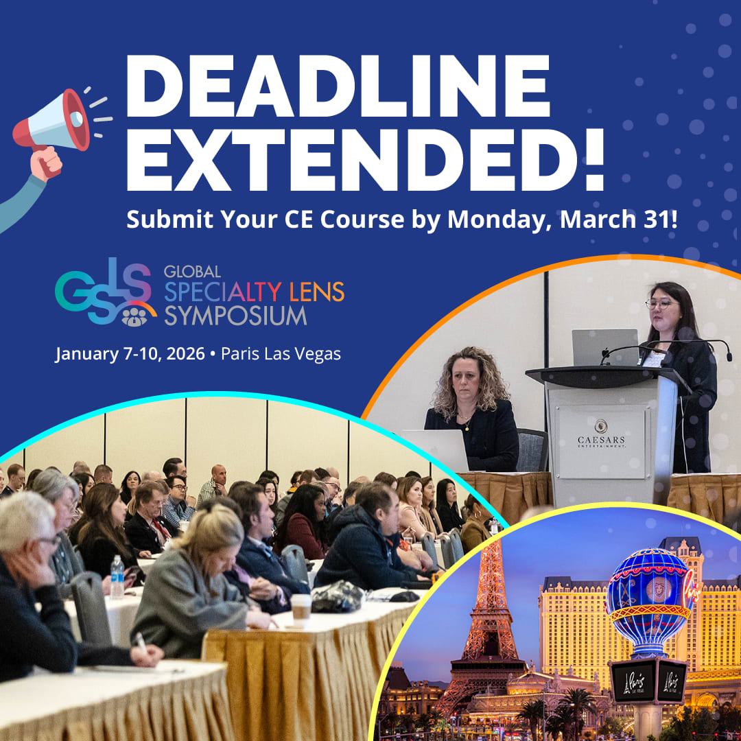 The Global Specialty Lens Symposium (GSLS) has opened submissions of engaging and informative 1-hour CE breakout courses or 2-hour CE workshops for GSLS 2026, happening January 7 to 10, 2026. Courses can cover specialty contact lens education topics, such as specialty contact lens fitting, scleral lenses, ocular surface disease, myopia management, keratoconus, orthokeratology, artificial intelligence, and more.