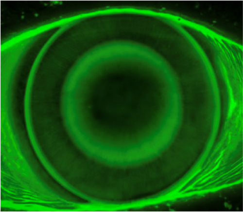 At the dispense visit, the lenses were placed on each eye. Visual acuity was 20/20 through each lens, and over-refraction yielded 20/20 with +0.75 OD and OS. Fluorescein pattern assessment showed an aligned central treatment zone with a centered bullseye ring and aligned peripheral curves. There was mild edge lift and adequate movement on blink to promote tear exchange. The lens fit was deemed acceptable in both eyes, and lenses were dispensed after the patient received training on lens care and handling.