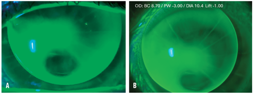For the corneal lens fitting, the ROSE K2 PG (Menicon) design was selected due to the oblate postsurgical corneas. For the right eye, a diagnostic lens with base curve (BC) of 9.00 mm showed acceptable centration, central pooling, superior and inferior bearing, and peripheral lift. Over-refraction yielded 20/30 VA. The final fit used BC 8.70 mm and reduced edge lift to optimize alignment, resulting in an appropriate fluorescein pattern.