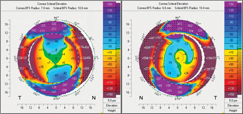 The scleral fitting initially appeared to be a very straightforward case: The patient presented with mild keratoconus OD<OS, refraction -3.75 -0.50 x 060, -7.50 sph. Best-corrected visual acuity (BCVA) was 20/25- OD, 20/50- OS. Scleral profilometry revealed a large amount of scleral toricity of 718 µm and 990 µm with-the-rule, OD, OS respectively, at a 16.5-mm chord. This was unexpected, as scleral toricity is typically reflective of the cornea in orientation and severity. Tomography scans showed only mild with-the-rule anterior corneal toricity OD and mild against-the-rule toricity OS (see Figure 1).