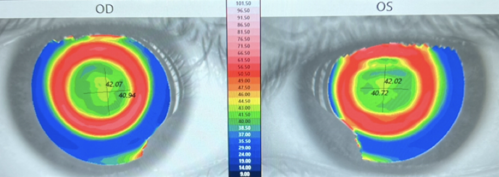 The elevation data allowed for precise quantification of sagittal height differences between the 2 principal meridians. In this case, the difference exceeded 30 µm, confirming the need for a toric stabilization zone design in the ortho-k lens. This helped optimize centration, comfort, and treatment zone stability. Axial lengths were above the pediatric age norm, further reinforcing the need for intervention.