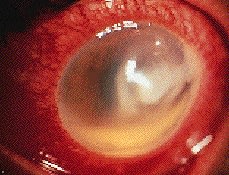 FIG. 4: CORNEAL ULCERS RESULTING FROM CONTACT LENS EXTENDED WEAR REQUIRE AGGRESSIVE TREATMENT. |