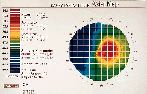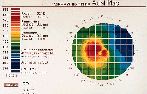 In refitting the patient, we knew it was important to appreciate the diverse topographies along the 180° meridian. The right eye revealed a temporal apical radius of 55.75D, which dramatically flattened nasally to 41.37D. The left eye had a temporal apical radius of 57.75D, which flattened 4.0mm nasally to 40.75D. In this situation, videokeratography (Figs. 1 & 2) clearly identified where the cornea was mid-peripherally steepest (where the contact lens would be loosest) and flattest (where the lens would be tightest).