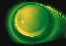 If the fluorescein pattern demonstrates excessive mid-peripheral bearing (steep fitting relationship), then the lens may not achieve unobstructed movement along the vertical corneal meridian when the patient looks down to read. Choosing a base curve 0.1mm flatter should improve translation.
