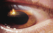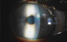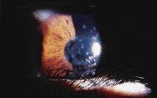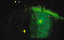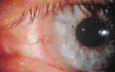 Bacterial ulceration (Figs. 9a & 9b) is the most severe and sight-threatening clinical entity associated with contact lens wear. All contact lens wearers have a higher risk for ulceration than non-contact lens wearers, but some risk factors are especially significant. Schein et al. (1989) pointed out that extended wear patients have a risk about 10 times greater than users of daily wear lenses. Other factors that increase the risk for bacterial ulceration in contact lens wearers include: diabetes, cigarette smoking, contaminated solutions and cases, use of topical steroids and reduced tear film. Fungal keratitis is very rare and more closely associated with trauma than with contact lens wear, but as Wilson and Ahearn pointed out in the American Journal of Ophthalmology (1996), contact lens wear can be associated with corneal and conjunctival fungal infection.